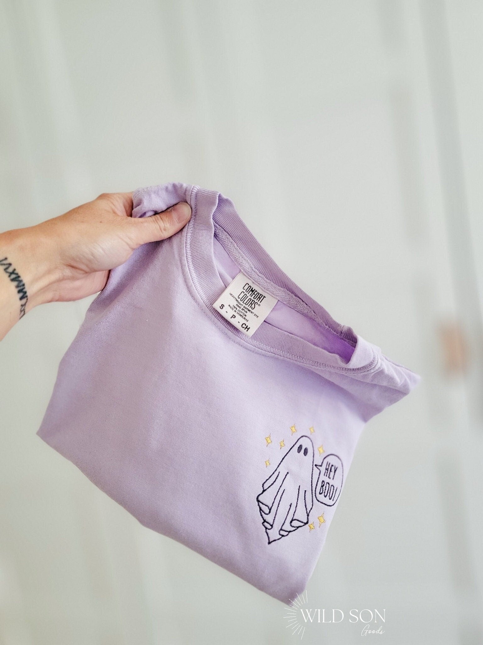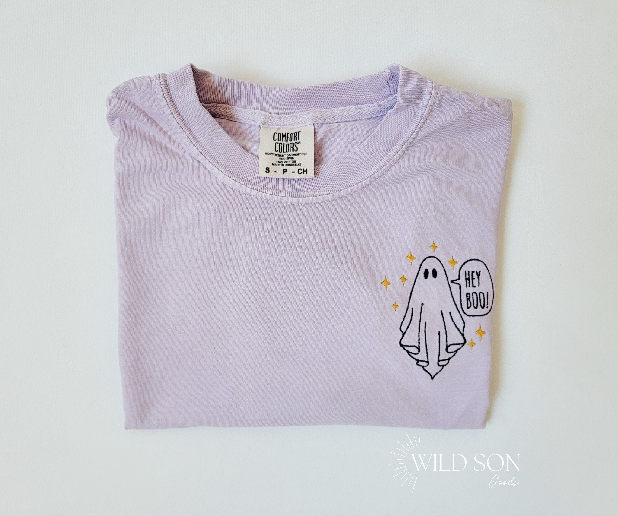 Hey Boo! ghost tee. Pre shrunk and garment dyed, these shirts get softer as you wash and wear them and last a lifetime! These have a vintage look and a lived in feel! Choose from many t-shirt and thread colors! Care Instructions: Machine wash cold gentle cycle. Tumble dry low. No bleach.